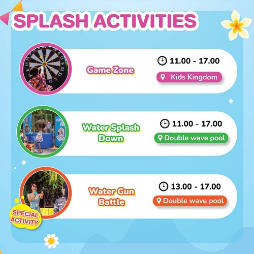 • สนุกสนานได้ทั้งวัน กับกิจกรรม Splash Activities ไม่ว่าจะเป็น Game Zone ที่โซน Kids Kingdom, Water Splash Down และ Water Gun Battle ที่โซน Double Wave Pool