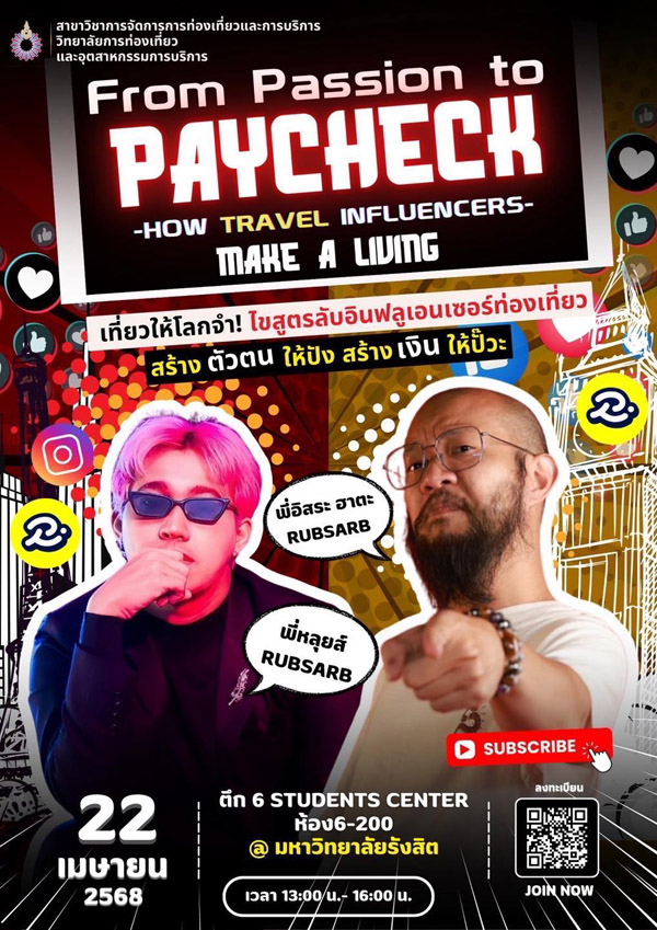 สาขาการจัดการการท่องเที่ยวและการบริการ วิทยาลัยการท่องเที่ยวและอุตสาหกรรมการบริการ มหาวิทยาลัยรังสิต เชิญชวนเข้าร่วมโครงการสัมมนา หัวข้อ “How Travel Influencers Make a Living : เปิดสูตรลับ เปลี่ยนการเที่ยวให้เป็นเงินล้าน” สำหรับผู้ที่ฝันอยากเป็นอินฟลูเอนเซอร์สายท่องเที่ยว ในวันอังคารที่ 22 เมษายน 2568 เวลา 13.00 – 16.00 น. ณ ห้อง 6-200 อาคารพิฆเนศ Student Center (อาคาร6) มหาวิทยาลัยรังสิต