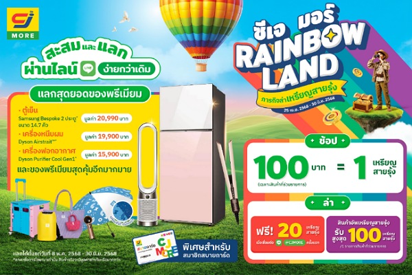 ซีเจ มอร์ (CJ MORE) ชวนลูกค้าออกเดินทางสู่ดินแดนแห่งสีสันไปกับ แคมเปญ “ซีเจ มอร์ เรนโบว์แลนด์ ภารกิจล่าเหรียญสายรุ้ง” ที่ไม่ได้มีแค่ความสนุก แต่ยังมาพร้อมความคุ้มค่าแบบจัดเต็มตลอดแคมเปญให้ลูกค้าสมาชิกสบายการ์ดทุกคน ได้ช้อปสะสมเหรียญสายรุ้ง เพื่อแลกเป็นของพรีเมียมสุดพิเศษ ที่คัดมาให้แบบ จึ้ง! จนอยากสะสมให้ครบทุกแบบ อาทิ กระเป๋าผ้าสุดคิวท์ ร่มเปลี่ยนสีได้ หรือพัดลมมือถือ ไปจนถึงรางวัลใหญ่สำหรับนักล่าเหรียญตัวยง ได้แก่ เครื่องฟอกอากาศ เครื่องหนีบผม จาก Dyson และตู้เย็น Samsung Bespoke นอกจากนี้ ยังอัปเกรดการสะสมและแลกของพรีเมียมให้ง่ายและสะดวกสบายกว่าเดิม ผ่าน LINE Official Account @CJMORE ตั้งแต่วันที่ 25 เมษายน – 30 มิถุนายน 2568 นี้ ที่ซีเจ มอร์ ทุกสาขา