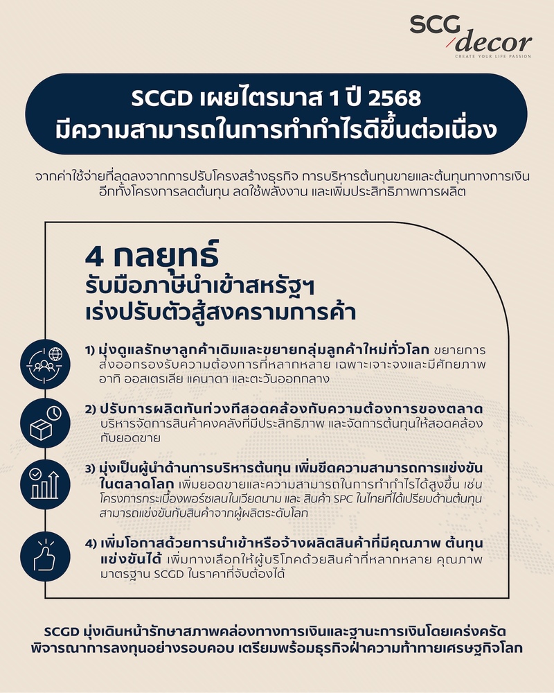 แม้ว่า ในปี 2567 บริษัทฯ มีรายได้การส่งออกสินค้าไปสหรัฐอเมริกาน้อยกว่าร้อยละ 1 ของยอดขายทั้งหมด แต่เพื่อรับมือกับความเปลี่ยนแปลงของตลาดในช่วงประกาศเลื่อนการขึ้นภาษีตอบโต้ออกไปอีก 90 วัน หรือความไม่แน่นอนที่อาจเกิดขึ้นในอนาคตที่สินค้าจากประเทศอื่นส่งออกมายังอาเซียนเพิ่มมากขึ้น บริษัทฯ จึงเร่งปรับตัวสู้สงครามการค้าพร้อมรับมือภาษีนำเข้าสหรัฐอเมริกา ด้วยการรักษาความสามารถการแข่งขันด้วยต้นทุน และเพิ่มประสิทธิภาพการผลิตทั้งในไทยและต่างประเทศ พร้อมเดินหน้าแผนด้วย 4 กลยุทธ์ ดังนี้1. มุ่งดูแลรักษาลูกค้าเดิม และขยายกลุ่มลูกค้าใหม่ทั่วโลก อีกทั้งเร่งขยายการส่งออกเพื่อรองรับความต้องการที่มีความหลากหลาย เฉพาะเจาะจง และมีศักยภาพมากขึ้น อาทิ ออสเตรเลีย แคนาดา และตะวันออกกลาง 2. ปรับการผลิตทันท่วงทีสอดคล้องกับความต้องการของตลาด บริหารจัดการสินค้าคงคลังที่มีประสิทธิภาพ และจัดการต้นทุนให้สอดคล้องกับยอดขาย 3. มุ่งเป็นผู้นำด้านการบริหารต้นทุนการผลิตสินค้า เพิ่มขีดความสามารถการแข่งขันในตลาดโลก ซึ่งจะช่วยเพิ่มยอดขายและความสามารถในการทำกำไรได้สูงขึ้น เช่น การเร่งโครงการกระเบื้องพอร์ซเลนในเวียดนาม ซึ่งมีความได้เปรียบด้านต้นทุน หรือการทำสินค้า SPC ในไทยให้มีต้นทุนที่สามารถแข่งขันกับสินค้าจากผู้ผลิตระดับโลกได้ ส่งผลให้ปริมาณการขายทั้งกระเบื้องพอร์ซเลนในเวียดนาม และสินค้า SPC ในไทยสูงขึ้นประมาณ 30% และ 40% เมื่อเทียบกับช่วงเดียวกันของปีก่อน ท่ามกลางสถานการณ์ตลาดที่ยังชะลอตัว และ 4. เพิ่มโอกาสด้วยการนำเข้าหรือจ้างผลิตสินค้าที่มีคุณภาพ ต้นทุนแข่งขันได้ นำเสนอสินค้าหลากหลายด้วยคุณภาพมาตรฐาน SCGD ในราคาที่จับต้องได้ เพื่อเพิ่มทางเลือกให้ผู้บริโภค ส่งผลให้สัดส่วนการนำเข้าของ SCGD เพิ่มขึ้นเป็นกว่า 18% เมื่อเทียบกับ 17% ของช่วงเดียวกันในปีก่อน อย่างไรก็ดี เพื่อลดผลกระทบจากความไม่แน่นอน บริษัทฯ จึงมีความระมัดระวังในการลงทุน และจัดลำดับความสำคัญโครงการการลงทุนเพื่อรักษาสภาพคล่องทางการเงินโดยเคร่งครัด”