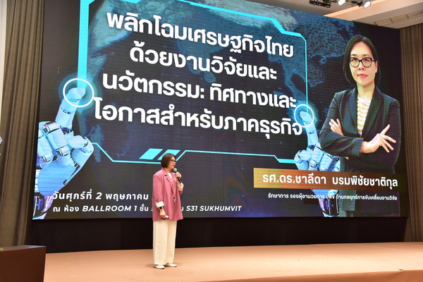 รศ.ดร.ชาลีดา บรมพิชัยชาติกุล รักษาการรองผู้อำนวยการกลุ่มงานกลยุทธ์วิจัย หน่วยบริหารและจัดการทุนด้านการเพิ่มความสามารถในการแข่งขันของประเทศ (บพข.) กล่าวถึงแนวทางการผลักดันนโยบายวิจัยที่ตอบโจทย์อุตสาหกรรมเป้าหมายในกลุ่ม S-Curve โดยสนับสนุนการเข้าถึงแหล่งทุนเพื่อร่วมกันต่อยอดเทคโนโลยีขั้นสูง