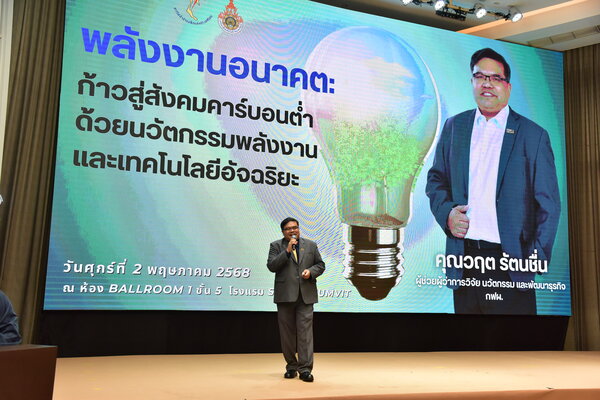 คุณวฤต รัตนชื่น ผู้ช่วยผู้ว่าการวิจัย นวัตกรรม และพัฒนาธุรกิจ การไฟฟ้าฝ่ายผลิตแห่งประเทศไทย (กฟผ.) นำเสนอการก้าวสู่สังคมคาร์บอนต่ำ ผ่านการพัฒนาเทคโนโลยีพลังงานสะอาด เช่น ระบบโครงข่ายไฟฟ้าอัจฉริยะ เทคโนโลยีจัดเก็บพลังงาน และระบบ AI เพื่อบริหารจัดการพลังงาน โดยเน้นย้ำถึงความร่วมมือกับมหาวิทยาลัยในด้านการวิจัยและพัฒนาแหล่งพลังงานหมุนเวียน เช่น โซลาร์เซลล์ พลังงานลม และไฮโดรเจน ทั้งยังมีการนำเสนอแนวทางการปรับเปลี่ยนองค์กรสู่ยุคดิจิทัล โดย คุณนพัตธร จิตรวิโรจน์ กรรมการผู้จัดการ บริษัท ทาวัต เมเนจเม้นท์ จำกัด ซึ่งเน้นการใช้เทคโนโลยีในการยกระดับประสิทธิภาพการผลิตและเพิ่มขีดความสามารถในการแข่งขันของภาคอุตสาหกรรมอย่างเป็นรูปธรรม โดยช่วงท้ายของงานได้มีการเปิดเวทีแลกเปลี่ยนความคิดเห็น เพื่อเสริมความเข้าใจเชิงลึกเกี่ยวกับแนวทางการพัฒนาโครงการวิจัยที่สามารถต่อยอดสู่การใช้ประโยชน์จริง และเข้าถึงแหล่งทุนได้อย่างมีประสิทธิภาพ.