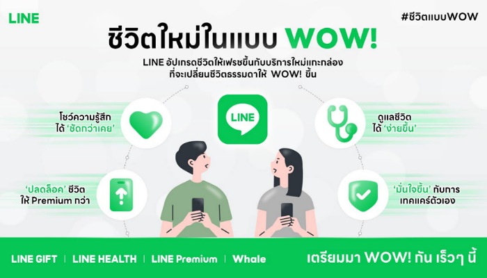 เพื่อเฉลิมฉลองก้าวสำคัญในปีที่ 14 LINE ประเทศไทย เตรียมยกระดับประสบการณ์ของผู้ใช้งานผ่านแนวคิด “ชีวิตใหม่ในแบบ WOW!” ที่มุ่งพัฒนาแพลตฟอร์มให้ตอบโจทย์ไลฟ์สไตล์ที่ “ดีขึ้นกว่าเคย” อย่างครบวงจร ครอบคลุมทั้งสื่อสาร ไลฟ์สไตล์และสุขภาพ โดยเน้น 4 แกนหลักประสบการณ์ ได้แก่ ปลดล็อกข้อจำกัดมากขึ้น – ลึกซึ้งขึ้น – ง่ายขึ้น และ มั่นใจขึ้น ซึ่งจะเชื่อมโยงผู้ใช้ผ่าน 4 บริการใหม่ที่จะเปิดตัวให้บริการเร็วๆนี้ อย่าง LINE Premium โปรแกรมสมาชิกสำหรับการใช้ LINE ที่อิสระกว่าที่เคย, LINE GIFT บริการ e-Gifting ที่จะเปลี่ยนมุมมองการให้ของขวัญในมิติใหม่ภายใต้คอนเซ็ปต์ Social Gifting, LINE HEALTH บริการที่เชื่อมต่อผู้ใช้กับผู้ให้บริการทางการแพทย์ออนไลน์ผ่านบัญชีทางการ ที่จะมาลดข้อจำกัดด้านการเดินทางและเวลา ซึ่งได้ทดลองให้บริการแล้ววันนี้ พร้อมด้วย Whale ศูนย์รวมผลิตภัณฑ์เพื่อสุขภาพที่เชื่อถือได้
