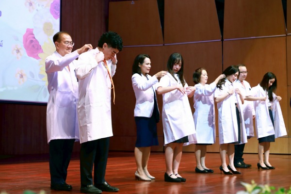 ทั้งนี้ “พิธีมอบเสื้อกาวน์และปฎิญาณตน” จัดขึ้นเพื่อนักศึกษาแพทย์ที่กำลังจะเริ่มต้นเรียนรู้ในระดับคลินิก ณ โรงพยาบาลนครปฐม โรงพยาบาลเพชรบูรณ์ และ โรงพยาบาลจุฬาภรณ์ ได้เตรียมความพร้อมสำหรับการเรียนรู้การทำงานในสภาพแวดล้อมทางคลินิก เพื่อการเติบโตเป็นแพทย์ที่มีคุณภาพและมีจริยธรรม นักศึกษาแพทย์ทุกคนได้ผ่านการเรียนรู้ในระดับเตรียมความพร้อมของความเป็นแพทย์ ช่วง Early Years ตลอดจนการปฏิบัติงานวิจัย ณ University College London มาแล้วเป็นเวลากว่า 4 ปี จึงถือเป็นอีกหนึ่งก้าวสำคัญในการเปลี่ยนผ่าน จากการเรียนในชั้นเรียนและห้องปฏิบัติการ สู่การเรียนรู้จากผู้ป่วยจริง ซึ่งจะกลายเป็น “อาจารย์” คนสำคัญของนักศึกษาต่อจากนี้ไป ซึ่งจะมีการเตรียมความพร้อมในการเปลี่ยนผ่านจากการเรียนในชั้น Early Years ไปสู่การเรียนรู้ในสภาพแวดล้อมทางคลินิกที่มีความซับซ้อน ต้องมีการประยุกต์ใช้ความรู้ให้เข้ากับบริบททางการแพทย์ รวมถึงการใช้ทักษะการสื่อสาร ทักษะการคิดวิพากษ์ (Critical Thinking) การประเมินสถานการณ์และการตัดสินใจ การปฏิบัติต่อผู้ป่วยอย่างมีคุณภาพและมีจริยธรรม โดยการฝึกฝนทักษะพื้นฐานทางคลินิก การสังเกต การสื่อสารและการวินิจฉัย เป็นสิ่งสำคัญสำหรับการดูแลผู้ป่วยอย่างเป็นองค์รวม นอกจากนี้แล้วยังช่วยให้นักศึกษาแพทย์เข้าใจวัฒนธรรมองค์กร การทำงานระหว่างเพื่อนร่วมงาน บุคลากรสหวิชาชีพ เข้าใจหลักจริยธรรมและจรรยาบรรณของแพทย์ รวมถึงทราบถึงวิธีการวัดและประเมินผลในชั้น Later Years ด้วย