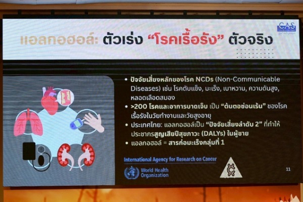 รศ.ดร.นพ.พลเทพ วิจิตรคุณากร ผู้อำนวยการศูนย์วิจัยปัญหาสุรา มหาวิทยาลัยสงขลานครินทร์ กล่าวว่า ข้อมูลจากกรมควบคุมโรค ปี 2562–2566 พบว่าบาดเจ็บและเสียชีวิตจากอุบัติเหตุบนท้องถนนที่เกี่ยวข้องกับแอลกอฮอล์เฉลี่ยปีละเกือบ 57,000 ราย รวม 5 ปี มากกว่า 284,000 ราย คิดเป็นมูลค่าความเสียหายทางเศรษฐกิจกว่า 370,000 ล้านบาท ที่น่าตกใจคือ คนไทยเกือบ 80% เคยได้รับผลกระทบจากการดื่มของผู้อื่น ทั้งด้านร่างกาย จิตใจ และปัญหาครอบครัว โดยต้นทุนทางสังคมเฉลี่ยจากนักดื่มไทยหนึ่งคนสูงถึง 498,196 บาท โดยเฉพาะนักดื่มชายมีต้นทุนสูงถึง 721,344 บาทต่อคน ซึ่ง “แอลกอฮอล์ยังคงเป็นหนึ่งในปัจจัยเสี่ยงหลักของโรคไม่ติดต่อเรื้อรัง และเป็นสารก่อมะเร็งกลุ่มที่ 1 ที่เชื่อมโยงกับมะเร็งอย่างน้อย 8 ชนิด อาทิ มะเร็งช่องปาก กล่องเสียง ลำไส้ใหญ่ ทวารหนัก เต้านม ตับ และตับอ่อน และจากตัวเลขทั้งหมดนี้สะท้อนถึงความจำเป็นเร่งด่วนในการขับเคลื่อนนโยบายและมาตรการลด ละ เลิกการดื่ม เพื่อปกป้องสุขภาพ เศรษฐกิจ และคุณภาพชีวิตของคนไทยทุกคน” รศ.ดร.นพ.พลเทพ กล่าว
