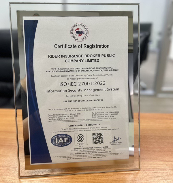 บริษัท ไรเดอร์ อินชัวรันส์ โบรกเกอร์ จำกัด (มหาชน) ได้รับการรับรองมาตรฐาน ISO/IEC 27001:2022 สำหรับระบบบริหารจัดการความมั่นคงปลอดภัยสารสนเทศ (Information Security Management System: ISMS) ที่ได้รับจากสถาบันรับรองคุณภาพมาตรฐานสากล Otabu Global Services Pvt.Ltd. ประเทศอินเดีย ที่ครอบคลุมทั้งธุรกิจนายหน้าประกันชีวิตและนายหน้าประกันวินาศภัย ซึ่งสะท้อนถึงความมุ่งมั่นของบริษัทในการเสริมสร้างความเชื่อมั่นด้านการรักษาความลับ ความครบถ้วน และความปลอดภัยของข้อมูลในทุกกระบวนการ