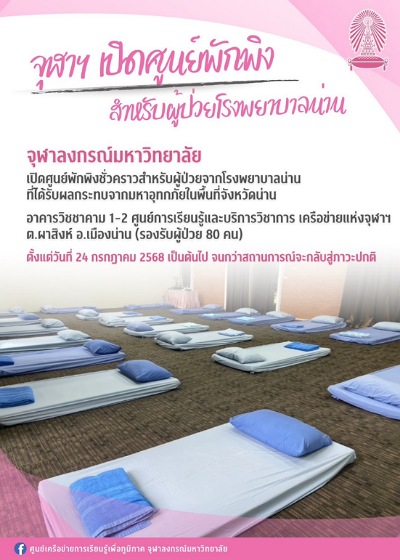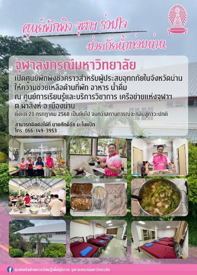 ด้วยความห่วงใยพี่น้องชาวน่านที่ได้รับผลกระทบจากภัยพิบัติน้ำท่วม จุฬาลงกรณ์มหาวิทยาลัย ได้เปิด ศูนย์พักพิงชั่วคราวสำหรับผู้ประสบอุทกภัย ตลอดจนเจ้าหน้าที่อาสาสมัครกู้ภัย โดยไม่มีค่าใช้จ่าย พร้อมให้บริการที่พัก อาหาร และน้ำดื่มใน 2 พื้นที่ ได้แก่