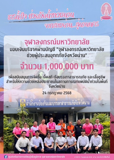 เพื่อเสริมศักยภาพในการช่วยเหลือประชาชนที่ได้รับผลกระทบจากสถานการณ์น้ำท่วมในจังหวัดน่าน จุฬาลงกรณ์มหาวิทยาลัยได้มอบเงินบริจาคผ่านบัญชี “จุฬาลงกรณ์มหาวิทยาลัย ช่วยผู้ประสบอุทกภัยจังหวัดน่าน”