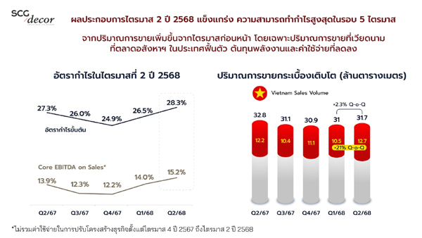 นายนำพล มลิชัย ประธานเจ้าหน้าที่บริหารและกรรมการผู้จัดการใหญ่ บริษัทเอสซีจี เดคคอร์ จำกัด (มหาชน) หรือ SCG Decor (SCGD) ผู้นำในธุรกิจเซรามิก วัสดุตกแต่งพื้นผิวและสุขภัณฑ์ ในภูมิภาคอาเซียน กล่าวว่า “ผลประกอบการไม่รวมค่าใช้จ่ายในการปรับโครงสร้างธุรกิจในไตรมาส 2 ปี 2568 มี EBITDA อยู่ที่ 879 ล้านบาท เพิ่มขึ้นร้อยละ 5 จากไตรมาสก่อน มีกำไร 283 ล้านบาท เพิ่มขึ้นร้อยละ 19 จากไตรมาสก่อน จากโครงการลดต้นทุนพลังงาน เร่งผลิตสินค้ามูลค่าเพิ่มสูง (HVA) รวมถึงปรับโครงสร้างธุรกิจส่งผลให้บริษัทฯ มีค่าใช้จ่ายที่ลดลง บริษัทมี EBITDAon salesอยู่ที่ร้อยละ 15.2 และอัตรากำไรสุทธิอยู่ที่ร้อยละ 4.8 ซึ่งสูงสุดในรอบ 5 ไตรมาสที่ผ่านมา นับตั้งแต่ไตรมาส 2 ของปี 2567