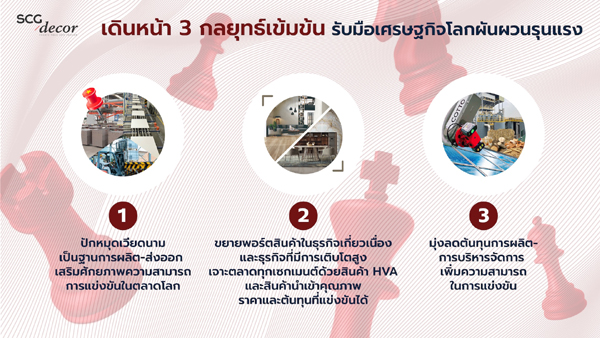 จากการที่บริษัทปรับตัวเชิงรุกพร้อมรับมือความผันผวน เดินหน้าติดตามสถานการณ์เศรษฐกิจโลกและในประเทศอย่างใกล้ชิด ทำให้มั่นใจว่าธุรกิจจะสามารถคว้าโอกาสจากความท้าทายจากเศรษฐกิจได้ด้วย 3 กลยุทธ์เข้มข้น ดังนี้ 1.) ปักหมุดเวียดนามเป็นฐานการผลิต-ส่งออก เสริมศักยภาพความสามารถการแข่งขันในตลาดโลก โดยเวียดนามเริ่มผลักดันต้นทุนการผลิตกระเบื้องให้เทียบเท่ากับผู้เล่นระดับโลกได้แล้ว อีกทั้งเร่งเพิ่มกำลังการผลิตกระเบื้องเกรซ พอร์ซเลนกว่า 25% ของกำลังการผลิตรวม ส่งผลให้เวียดนามมีปริมาณการขายกระเบื้องเกรซ พอร์ซเลนสูงขึ้นสอดคล้องกับความนิยมและความต้องการของตลาด เตรียมพร้อมเป็นฐานการผลิตเพื่อส่งออก รองรับการเติบโตของภูมิภาค 2.) ขยายพอร์ตสินค้าในธุรกิจเกี่ยวเนื่อง และธุรกิจที่มีการเติบโตสูง เจาะตลาดทุกเซกเมนต์ด้วยสินค้า HVA และสินค้านำเข้าคุณภาพ ราคาและต้นทุนที่แข่งขันได้ อาทิ กลุ่มสินค้ามูลค่าเพิ่มสูง (HVA) ปัจจุบันบริษัทมียอดขายกลุ่ม HVA กว่า 37% ของรายได้จากการขายเทียบกับปีก่อนที่ 34% อีกทั้งขยายพอร์ตสินค้าในธุรกิจเกี่ยวเนื่องในไทย ที่จะเพิ่มโอกาสความหลากหลาย (Sourcing) ตอบโจทย์กลุ่มที่มีความต้องการเฉพาะเจาะจง 3.) มุ่งลดต้นทุนการผลิต-การบริหารจัดการ เพิ่มความสามารถในการแข่งขัน ได้แก่ ลดต้นทุนการผลิตแล้วกว่า 36 ล้านต่อปี ด้วยโครงการการใช้พลังงานทดแทนจากแสงอาทิตย์และเชื้อเพลิงชีวมวลที่แล้วเสร็จในปีนี้ อีกทั้งโครงการเพิ่มประสิทธิภาพการผลิตเพิ่มเติมอาทิ โครงการติดตั้งระบบ Hot Air Generator ที่โรงงานนิคมหนองแค ทดแทนการใช้เชื้อเพลิงฟอสซิลจะแล้วเสร็จภายในไตรมาสที่ 1 ปี 2569 ลดต้นทุนการบริหารจัดการ ด้วยการปรับลดเงินทุนหมุนเวียน (Working Capital) อย่างต่อเนื่อง ด้วยการควบคุมสินค้าคงคลัง และบริหารจัดการลูกหนี้ทางการค้า อีกทั้งการปรับโครงสร้างธุรกิจใช้ AI และระบบ Digital เพื่อเพิ่มประสิทธิภาพการทำงาน สามารถลดต้นทุนรวมได้กว่า 140 ล้านบาทต่อปี” นายนำพล กล่าว