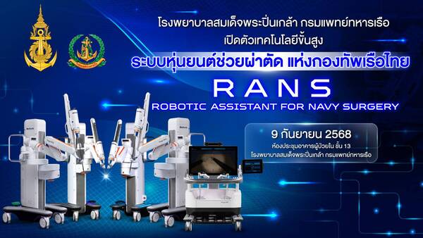 กองทัพเรือ โดย โรงพยาบาลสมเด็จพระปิ่นเกล้า กรมแพทย์ทหารเรือ เปิดตัวเทคโนโลยีขั้นสูง“ระบบหุ่นยนต์ช่วยผ่าตัด แห่งกองทัพเรือไทย RANS : Robotic Assistant for Navy Surgery” เครื่องแรกของโรงพยาบาลในสังกัดกระทรวงกลาโหม