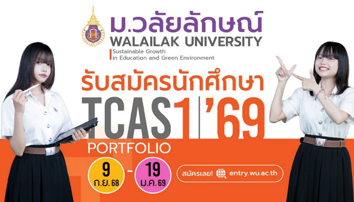 มหาวิทยาลัยวลัยลักษณ์ กำลังดำเนินการเปิดรับสมัครคัดเลือกบุคคลเพื่อเข้าศึกษาต่อในระดับปริญญาตรี ระบบ TCAS รอบที่ 1 Portfolio ประจำปีการศึกษา 2569 ผ่านเว็บไซต์ https://entry.wu.ac.th จำนวนรวมทั้งสิ้นกว่า 3,499 คน ตั้งแต่วันที่ 9 กันยายน 2568- 19 มกราคม 2569 โดยในรอบ Portfolio จะมีการเปิดรับสมัคร จำนวน 5 รอบย่อย ดังนี้