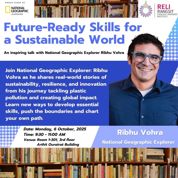 สถาบันภาษา มหาวิทยาลัยรังสิต ขอเชิญนักศึกษา คณาจารย์ บุคลากร และผู้สนใจทั่วไป เข้าร่วมกิจกรรมบรรยายพิเศษในหัวข้อ “มาเรียนรู้ทักษะเพื่ออนาคตที่ยั่งยืน” ในวันวันจันทร์ที่ 6 ตุลาคม 2568 เวลา 09.30 – 11.00 น. (เริ่มลงทะเบียนตั้งแต่ 09.00 น. เป็นต้นไป) ณ ห้อง 1-301 ชั้น 3 อาคารอาทิตย์ อุไรรัตน์ (อาคาร 1) มหาวิทยาลัยรังสิต ภายในงานได้รับเกียรติจาก Mr. Ribhu Vohra ผู้เชี่ยวชาญด้านสิ่งแวดล้อมจาก National Geographic ที่จะมาแบ่งปันประสบการณ์จริงจากการทำงานในระดับนานาชาติ สำหรับผู้ที่สนใจสามารถเข้าร่วมฟังการบรรยายได้โดยไม่มีค่าใช้จ่าย ทั้งนี้ สอบถามรายละเอียดเพิ่มเติม และรับชมการถ่ายทอดสดได้ทาง Facebook Page: Rangsit English Language Institute
