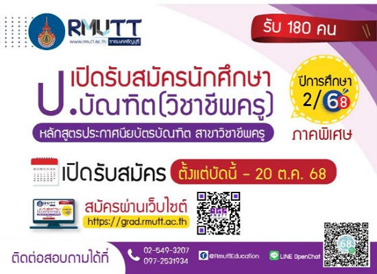 คณะครุศาสตร์อุตสาหกรรม มหาวิทยาลัยเทคโนโลยีราชมงคลธัญบุรี (มทร.ธัญบุรี) เปิดรับสมัครและสอบคัดเลือกบุคคลเข้าศึกษาระดับประกาศนียบัตรบัณฑิต สาขาวิชาชีพครู ภาคพิเศษ ประจำภาคการศึกษาที่ 2 ปีการศึกษา 2568 ตั้งแต่บัดนี้ – 20 ตุลาคม 2568 โดยคุณสมบัติของผู้สมัคร สำเร็จการศึกษาระดับปริญญาตรีทุกสาขาหรือเทียบเท่า จากสถาบันการศึกษาที่ ก.พ. และกระทรวงการอุดมศึกษาวิทยาศาสตร์วิจัย และนวัตกรรม ให้การรับรอง ในสาชาวิชาที่สอดคล้องกับหลักสูตรการศึกษาปฐมวัย หรือตรงกับกลุ่มสาระการเรียนรู้หลักสูตรแกนกลางการศึกษาขั้นพื้นฐาน หรือสอดคล้องกับหลักสูตรอาชีวศึกษา ผู้สนใจสามารถสมัครได้ทาง www.gadrmuttacth หรือสอบถามเพิ่มเติมได้ที่ www.facebook.com/RmuttEducation โทร. 0-2549-3207 097-2531934 https://grad.rmutt.ac.th/