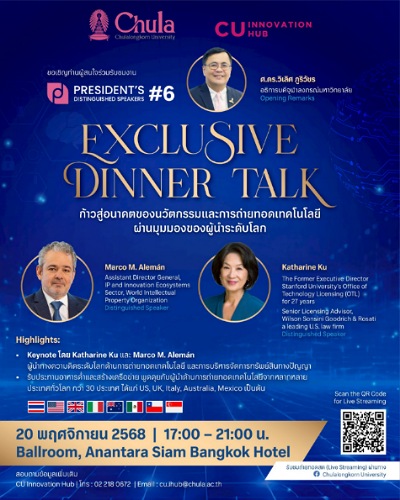 จุฬาลงกรณ์มหาวิทยาลัยขอเชิญชวนบุคคลทั่วไป ผู้สนใจด้านนวัตกรรม และบุคลากรในระบบนิเวศธุรกิจนวัตกรรม เข้าร่วมรับชมการถ่ายทอดสด (Live Streaming) งาน “President’s Distinguished Speaker” ครั้งที่ 6 เพื่อเปิดมุมมองและรับฟังแนวคิดจากสองผู้นำระดับโลกด้านนวัตกรรม และทรัพย์สินทางปัญญาที่จะมาร่วมแบ่งปันประสบการณ์การพัฒนาระบบนิเวศนวัตกรรมและการจัดการทรัพย์สินทางปัญญาในระดับสากล