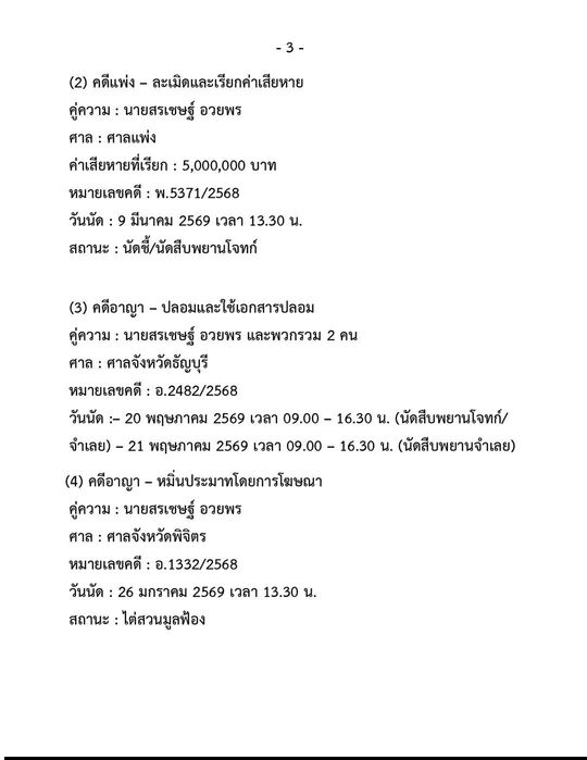 วันนัด :– 20 พฤษภาคม 2569 เวลา 09.00 – 16.30 น. (นัดสืบพยานโจทก์/
