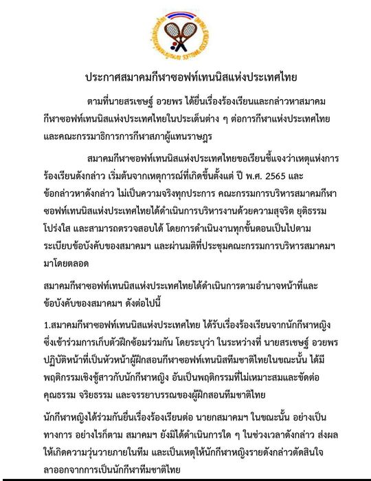 สมาคมกีฬาซอฟท์เทนนิสแห่งประเทศไทยขอเรียนชี้แจงว่าเหตุแห่งการร้องเรียนดังกล่าว เริ่มต้นจากเหตุการณ์ที่เกิดขึ้นตั้งแต่ ปี พ.ศ. 2565 และข้อกล่าวหาดังกล่าว ไม่เป็นความจริงทุกประการ คณะกรรมการบริหารสมาคมกีฬาซอฟท์เทนนิสแห่งประเทศไทยได้ดำเนินการบริหารงานด้วยความสุจริต ยุติธรรม โปร่งใส และสามารถตรวจสอบได้ โดยการดำเนินงานทุกขั้นตอนเป็นไปตาม