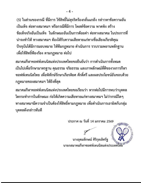 สมาคมกีฬาซอฟท์เทนนิสแห่งประเทศไทยประกาศขอใช้สิทธิ์กรณีที่มีการ โพสต์ข้อความ พาดพิง สร้างข้อเท็จจริงอันเป็นเท็จ ในลักษณะอันเป็นการด้อยค่า ต่อทางสมาคม ในประการที่น่าจะทำให้ ทางสมาคมฯ ต้องได้รับความเสียหายแก่ทางชื่อเสียงเกียรติคุณ จึงให้ที่กฎหมาย ดำเนินการ รวบรวมพยานหลักฐานเพื่อใช้สิทธิ์ฟ้องร้องตามกฏหมายต่อไป
