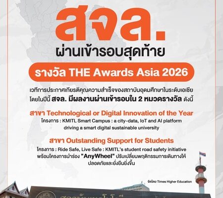 สถาบันเทคโนโลยีพระจอมเกล้าเจ้าคุณทหารลาดกระบัง(สจล.) ผ่านเข้ารอบ ในเวที Times Higher Education (THE) Awards 2 โครงการ ควบคู่กับการติดอันดับ Top ของประเทศไทยใน 4 กลุ่มสาขา จาก THE World University Rankings by Subject 2026 สะท้อนความโดดเด่นของมหาวิทยาลัยด้านนวัตกรรม เทคโนโลยีดิจิทัล การสนับสนุนนักศึกษา และคุณภาพทางวิชาการ ตอกย้ำศักยภาพของ สจล. ในการขับเคลื่อนการศึกษา งานวิจัย และการพัฒนาที่ยั่งยืน จนได้รับการยอมรับในเวทีระดับเอเชียและนานาชาติ
