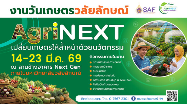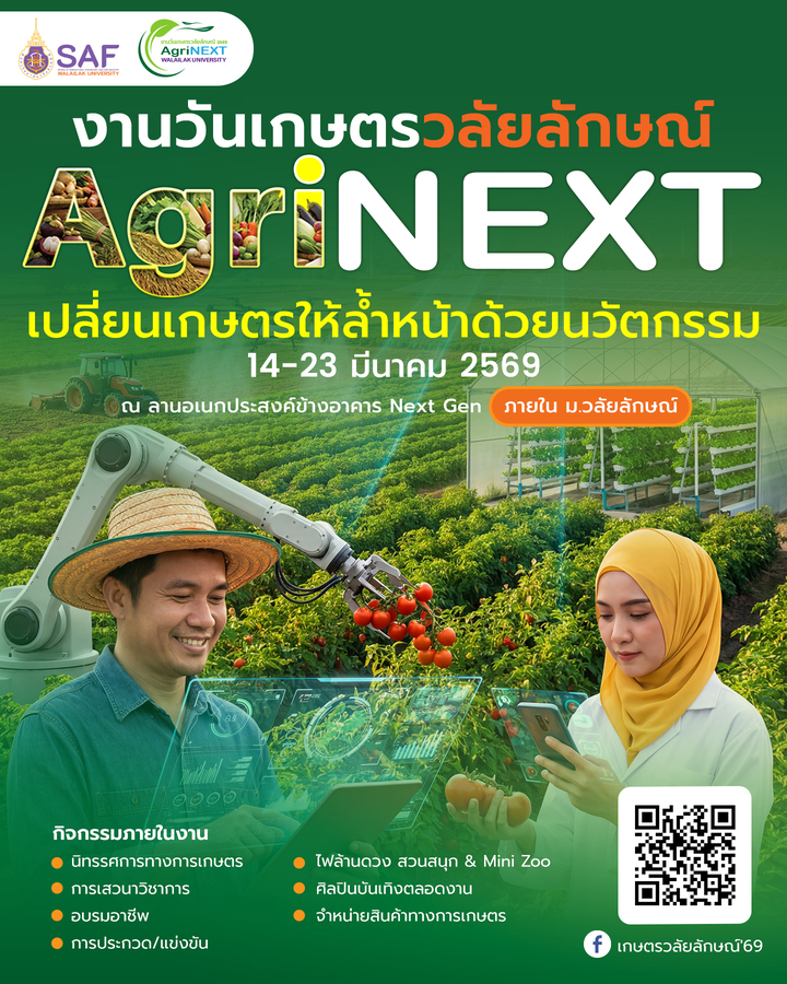 ม.วลัยลักษณ์ พร้อมจัดใหญ่ “งานวันเกษตรวลัยลักษณ์ 2569” ชูแนวคิด “AgriNEXT: เปลี่ยนเกษตรให้ล้ำหน้าด้วยนวัตกรรม” 10 วัน 10 คืน 14-23 มี.ค.นี้ ชวนชมนิทรรศการเกษตรอัจฉริยะ 4 โซน ช้อปสินค้าเกษตร อบรมอาชีพ และสนุกกับกิจกรรมประกวดและบันเทิงครบวงจร