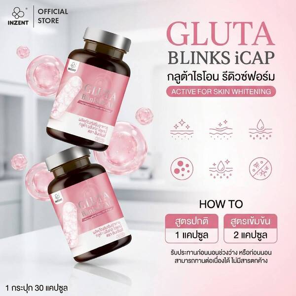 บริษัท INZENT เปิดตัว Gluta Blinks iCAP ทางเลือกของการดูแลผิวจากภายในรูปแบบแคปซูล ที่พัฒนาภายใต้แนวคิดการดูแลผิวจากภายในอย่างต่อเนื่อง โดยเลือกใช้สารสำคัญอย่าง L-Cystine และ L-Glutathione พร้อมผ่านกระบวนการผลิตด้วย iCAP Technology