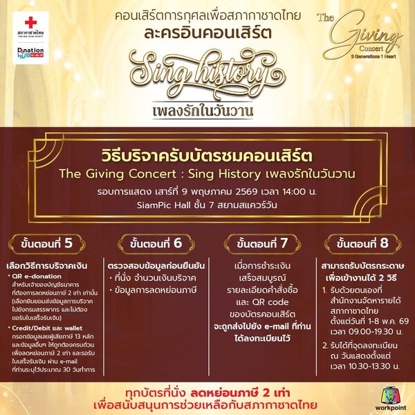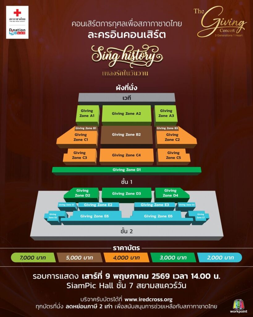 The Giving Concert ไม่ได้มอบเพียงความสุขผ่านบทเพลงอันไพเราะ หากยังเป็นอีกหนึ่งพลังสำคัญในการส่งต่อโอกาสและความช่วยเหลือเพื่อสนับสนุนภารกิจของสภากาชาดไทย ร่วมเป็นส่วนหนึ่งของการให้ที่มีความหมายผ่านบทเพลงอันไพเราะ ทุกที่นั่งคือเงินบริจาค พร้อมรับสิทธิลดหย่อนภาษี 2 เท่า บัตรบริจาคราคา 7,000 / 5,000 / 4,000 / 3,000 และ 2,000 บาท ได้บุญ ได้บัตร แล้ววันนี้ ที่ www.iredcross.org Line: @iredcross หรือ โทรศัพท์: 02 2564440 กด 7