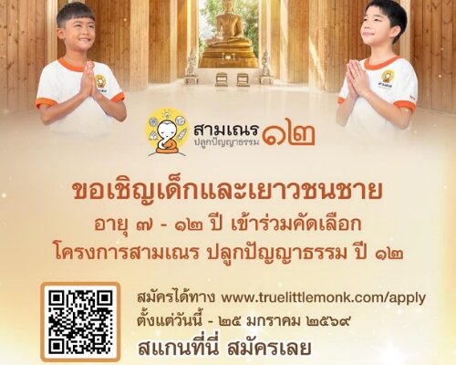 ทรูปลูกปัญญา ชวนเยาวชนเสริมธรรมะ รับหน้าร้อนปี 2569 กับโครงการ “สามเณร ปลูกปัญญาธรรม ปีที่ 12” ณ สถานปฏิบัติธรรมธวีธรรม อ.ปากช่อง จ.นครราชสีมา โดยเครือเจริญโภคภัณฑ์ และทรู คอร์ปอเรชั่น เชิญชวนเยาวชนชายใฝ่ธรรมะ อายุระหว่าง 7-12 ปี ทั่วประเทศ เข้าร่วมสมัครคัดเลือกเพื่อก้าวสู่เส้นทางแห่ง สติ–สมาธิ–ปัญญา ผ่านการเรียนรู้และปฏิบัติตามวิถี